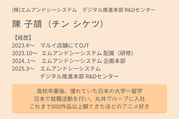 丸井グループでは「お客さまのお役に立つために進化し続ける」「人の成長=企業の成長」を経営理念に掲げ、人的資本経営に取り組んでいます。手挙げ制による学びの場への参加やグループ間職種変更など、多くの社員がさまざまな経験をそれぞれのキャリアに役立てて活躍しています。 連載「カラフルキャリア~私の原動力~」では、多様なキャリアで活躍する社員に注目し、その原動力をひも解いていきます。今回は「若手の活躍」をテーマに、全社のシステム企画・開発を担うエムアンドシ-システムのDX研究開発部門で活躍する陳子頡さんにお話をうかがいました。