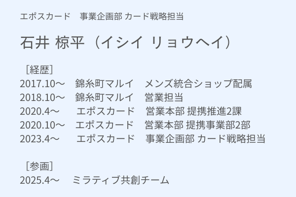 丸井グループでは「お客さまのお役に立つために進化し続ける」「人の成長=企業の成長」を経営理念に掲げ、人的資本経営に取り組んでいます。手挙げ制による自主的な学びの場への参加やグループ間職種変更など、多くの社員がさまざまな経験をそれぞれのキャリアに役立てて活躍しています。 連載「カラフルキャリア~私の原動力~」では、多様なキャリアで活躍する社員に注目し、その原動力をひも解いていきます。今回は「若手管理職」をテーマに、エポスカードの企画・戦略部門で活躍する石井椋平さんにお話をうかがいました。